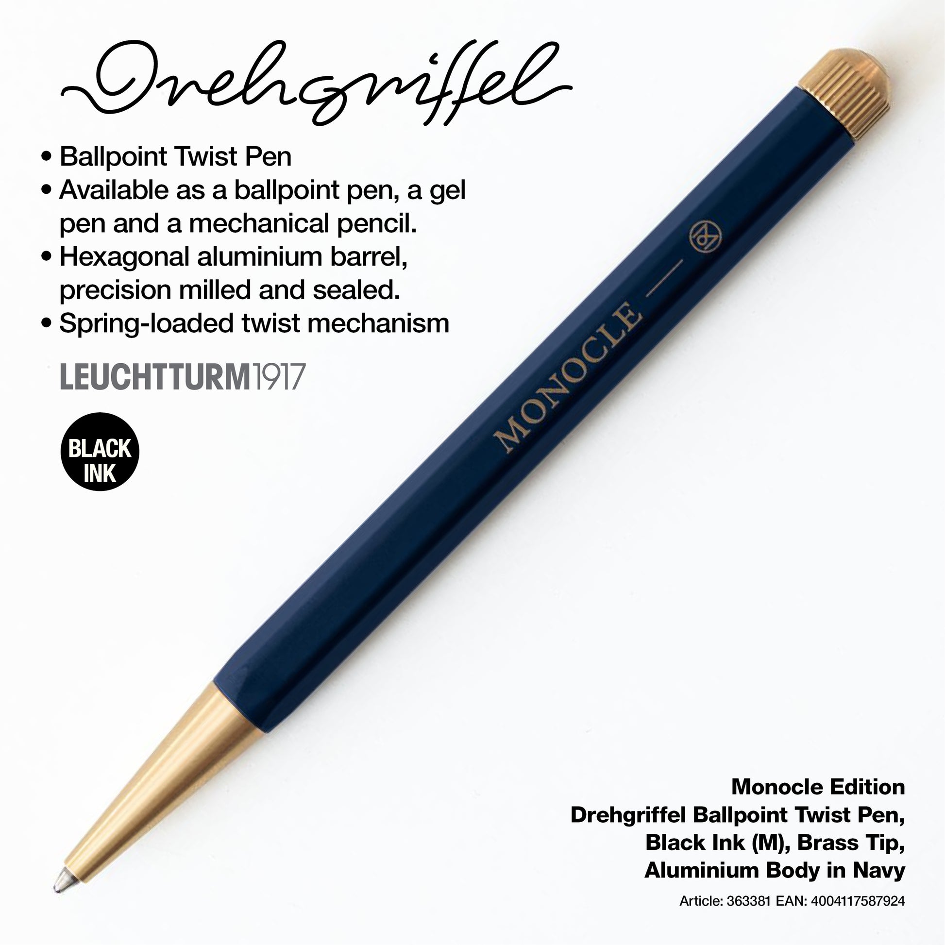 Monocle Edition Ballpoint Twist Pen, Black Ink (M), Brass Tip, Aluminium Body in Navy