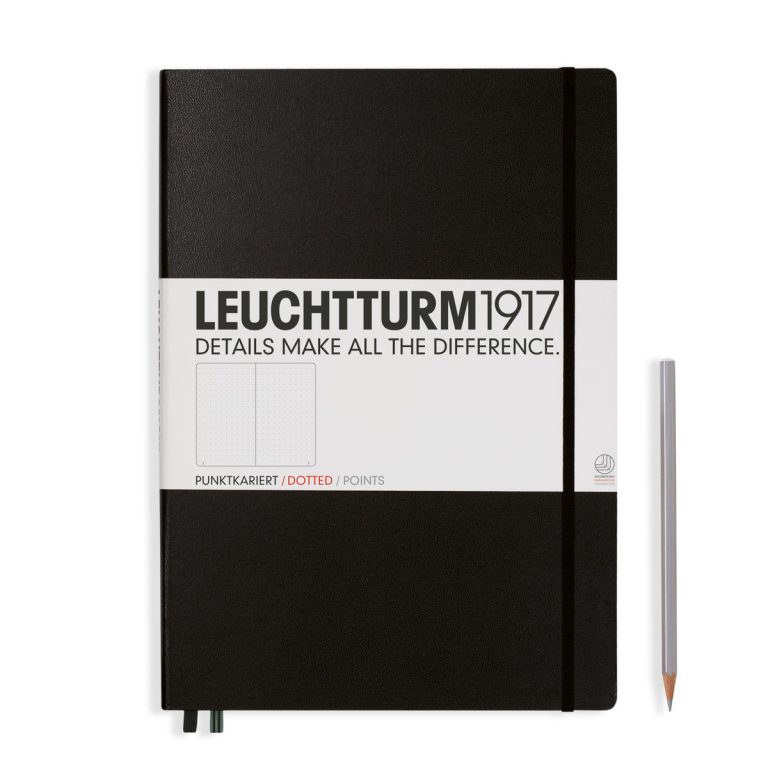 The classic: Master notebook. Larger than A4, it can hold loose sheets between the pages and in the expandable pocket without the edges protruding. The Master Classic notebook has 233 non-bleeding, acid-free 100 g/m2 pages. This means that our Master Classic notebook is an indispensable treasure for all notebook-lovers. Choose between red and black covers and our 4 rulings (ruled, squared, dotted or plain).