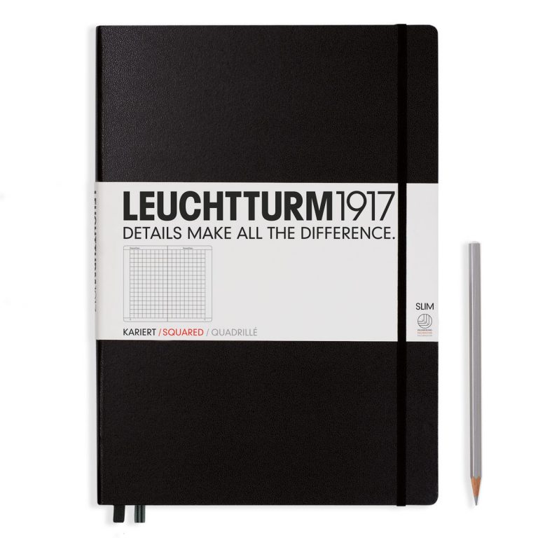 The slim alternative: our Master Slim. The Master Slim is also larger than A4 and can hold loose sheets between the pages and in the expandable pocket without the edges protruding. Furthermore, the Master Slim notebook features 100 g/m² paper. However, it only has 121 pages and is therefore 33% lighter than the Master Classic notebook. This means that the Master Slim is the ideal companion for all notebook-lovers who want to write in ink and always have their notebook to hand.