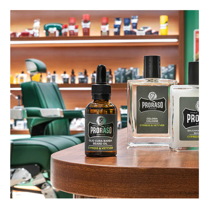 Proraso’s Cypress & Vetyver Beard Oil is formulated to tame, smooth, nourish and protect a long, thick beard. Ome...