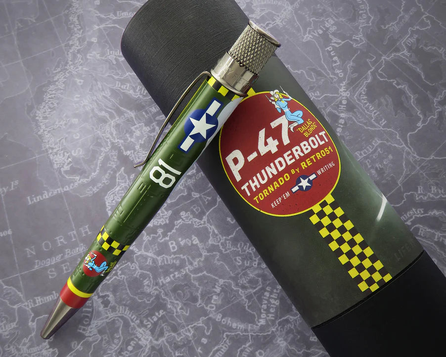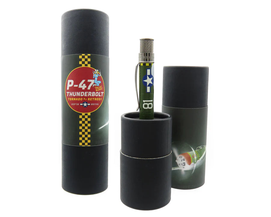 The Retro51 P-47 Thunderbolt is now taking off to fly alongside the P-51 and Corsair in the Vintage Metalsmith series. This warbird pen is designed after the most popular World War II U.S. fighter plane with over 15,000 units produced. It was known for its heavy artillery that successfully served in offensive air-to-air combat plus skillful ground attack. Its rugged construction allowed it to withstand battle damage and still remain airworthy. The Tornado emulates the P-47 with its acid-etched rivets and paneling on the barrel and painted with the striking red, yellow and green color scheme. It's emblazoned with the nose art of the 352nd Fighter Group's P-47 nicknamed "Dallas Blonde," and complete with antique silver trim and matching checkered finial. Pick up this beaut and prepare for your next mission.