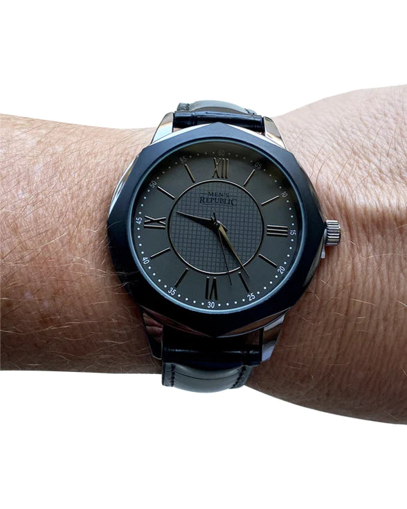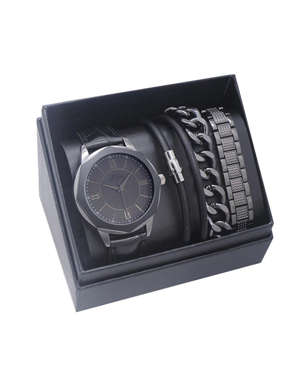 The Men's Republic Watch Set in Gun Metal embodies both sophisticated style and practical design. It's a statement piece for the modern man, combining the functionality of a quartz movement watches with the elegance of gun metal. This ensemble is more than a timekeeper; it's a symbol of meticulous craftsmanship and timeless design, perfect for a self-gifter who appreciates the finer things in life.