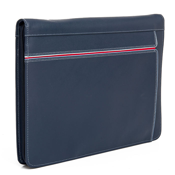 Our unique and colourful office portfolio is made with our signature soft nappa leather with contrasting coloured stitching. Inside there's space for an A4 notepad and six credit or business cards as well as a transparent window for ID. A zipped pocket holds your important personal items while a central pen slot completes a perfect professional look for this unique and colourful folder.